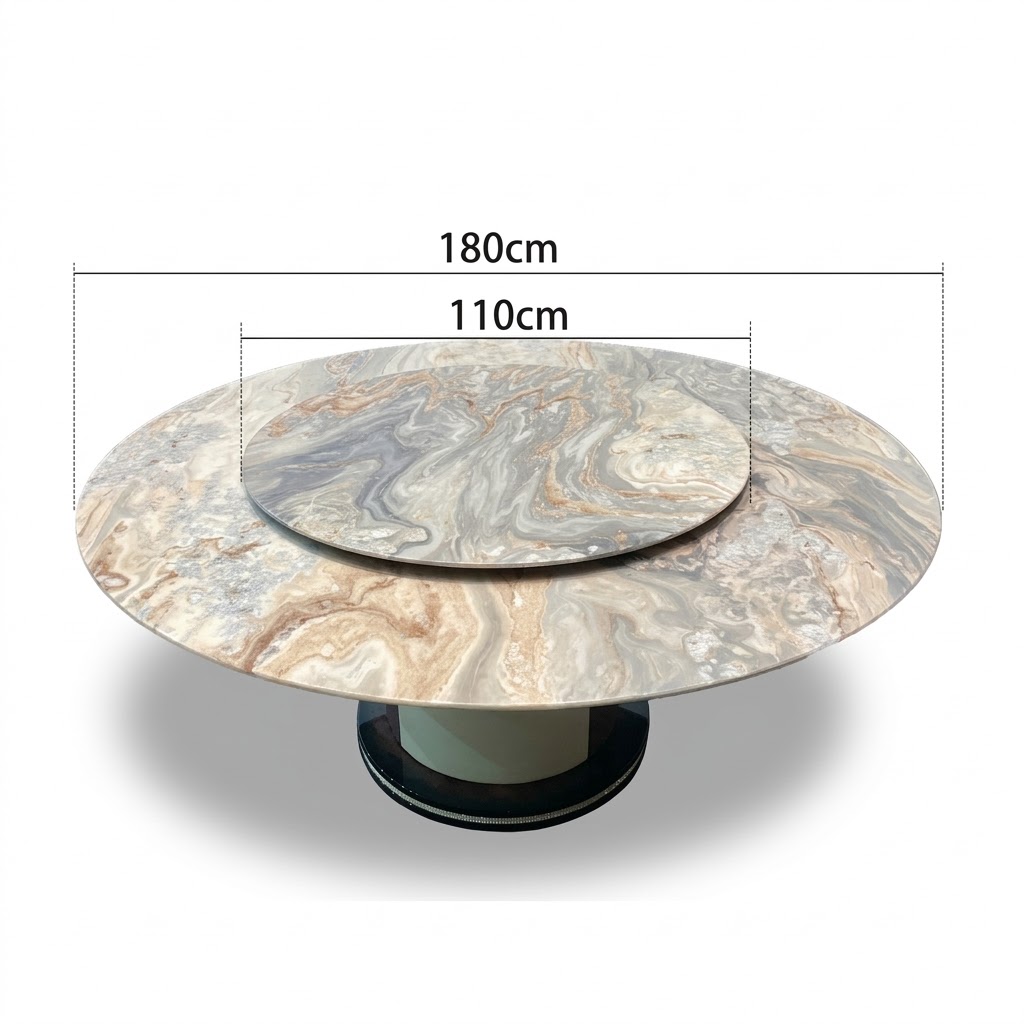 Mặt bàn tròn đường kính 180cm mang lại cảm giác bề thế và sang trọng, phù hợp với không gian rộng.