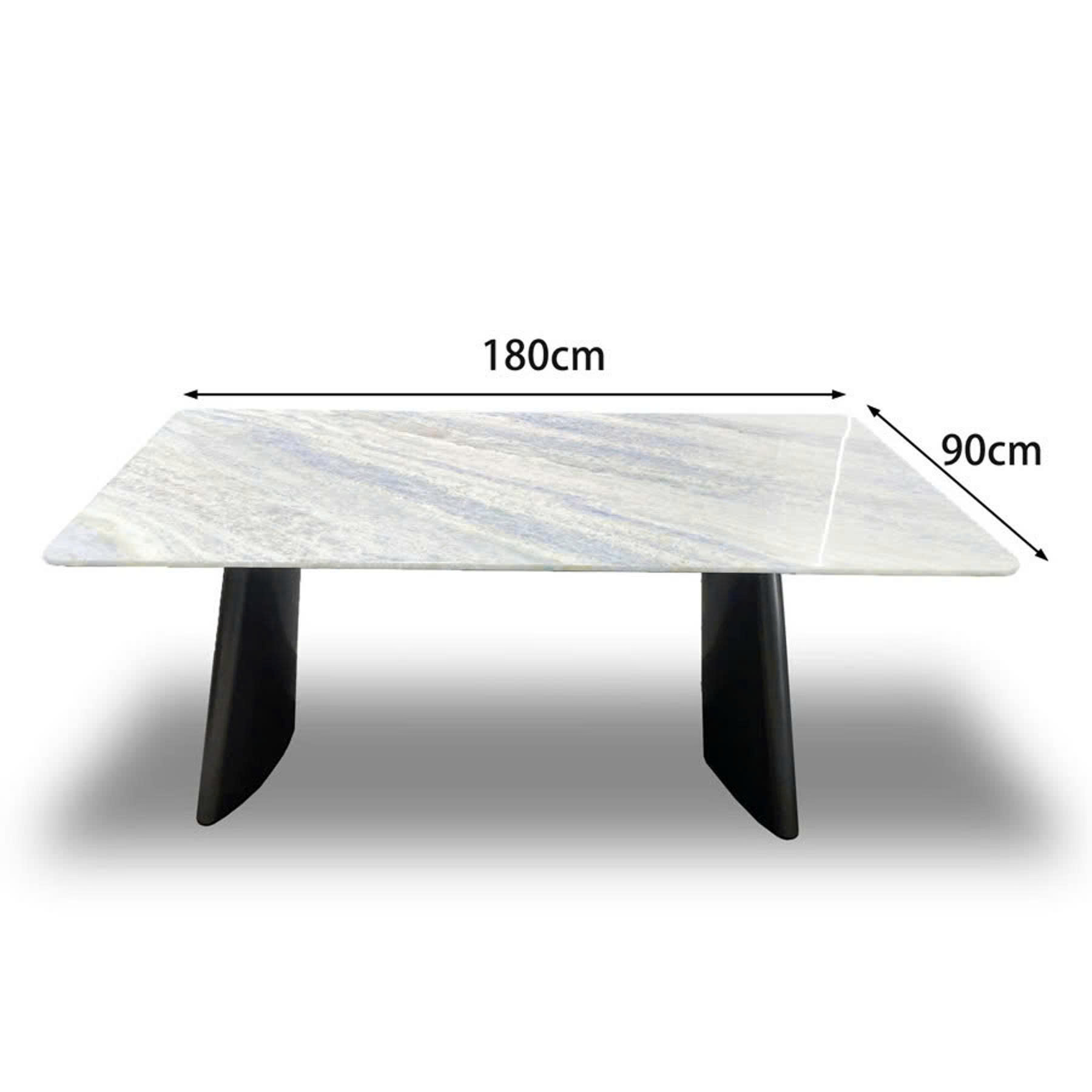 Thiết kế mặt bàn chữ nhật mang lại sự rộng rãi, khỏe khoắn và hiện đại cho không gian. Điểm nhấn đặc biệt là những đường vân đá tự nhiên trải dài trên mặt bàn vô cùng đẹp mắt. Chân bàn được thiết kế dạng khối liền mạch với chất liệu cao cấp sơn đen nhám, tạo hình vát nghiêng độc đáo, vừa chắc chắn vừa mang tính thẩm mỹ cao. Kích thước tổng thể chiều dài 180cm, chiều rộng 90cm vô cùng rộng rãi, phù hợp với nhiều không gian phòng khách hoặc phòng ăn cao cấp.