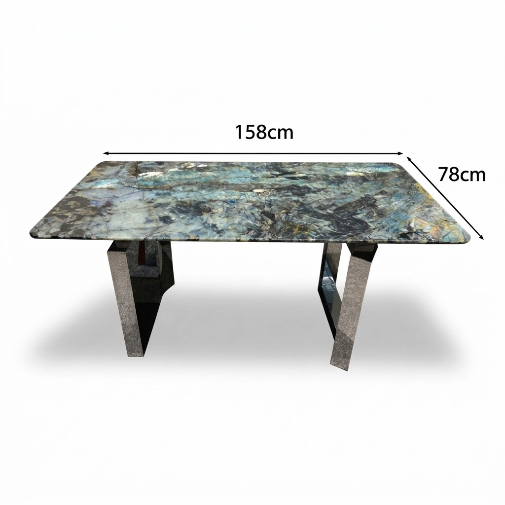 Bàn Trà HTBT012 sử dụng đá tự nhiên cao cấp với các mảng vân xà cừ ánh xanh nổi bật trên nền đá tối, tạo hiệu ứng ánh sáng vô cùng cuốn hút khi nhìn từ nhiều góc độ.
