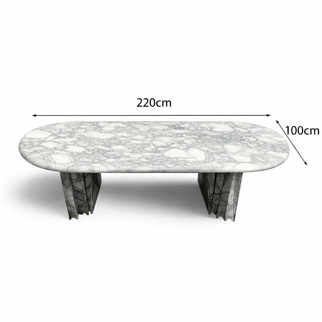 Bàn được thiết kế dạng oval (bầu dục) với kích thước lớn 220cm x 100cm, tạo cảm giác mềm mại nhưng vẫn rất bề thế, phù hợp với những không gian rộng.