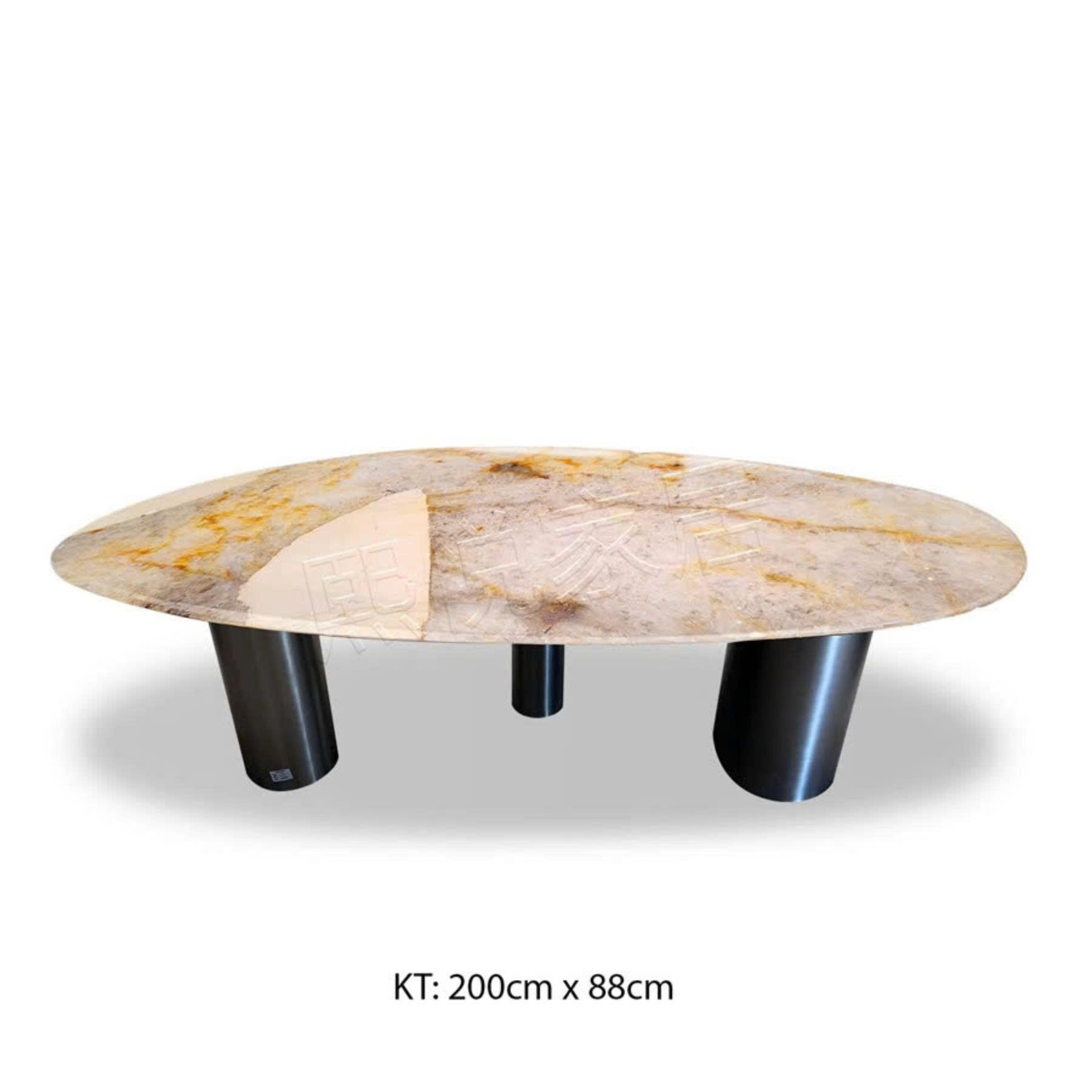 Mặt bàn thiết kế dạng oval (bo tròn hai đầu) với kích thước 200cm x 88cm, tạo cảm giác mềm mại và an toàn khi sử dụng.