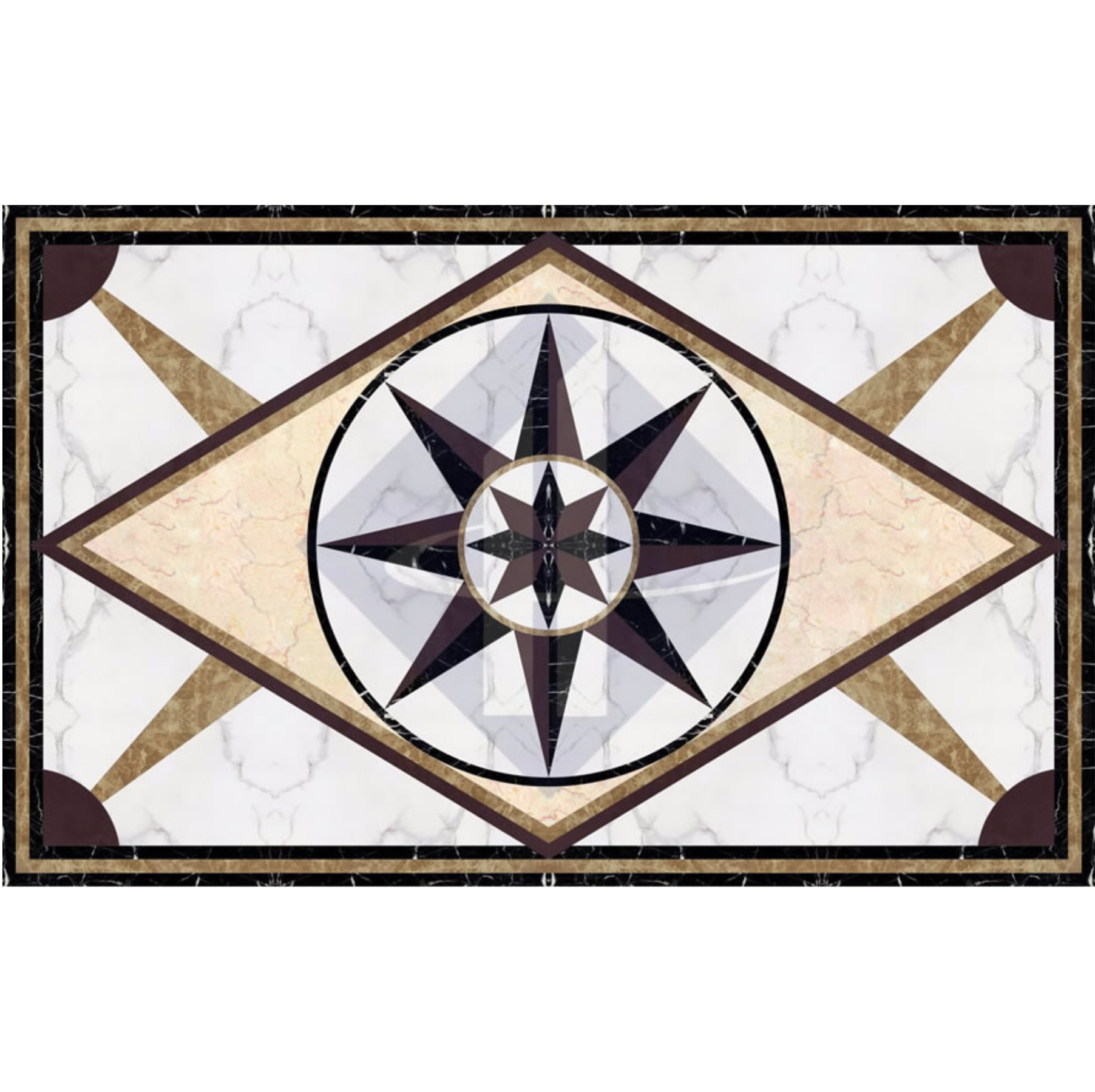 HT-HVCN011 từ bỏ những đường nét hoa lá uốn lượn quen thuộc để nhường chỗ cho sự dứt khoát của hình học. Ở vị trí trung tâm là một ngôi sao 8 cánh lồng ghép đa chiều (phong cách la bàn) nằm trọn trong một vòng tròn hoàn hảo. Bao quanh nó là cấu trúc hình thoi lớn màu be sáng, được neo giữ bởi các đường chéo và viền khung hình chữ nhật kép đen – vàng. Bốn góc được nhấn nhá bằng các phần tư hình tròn màu tối, giúp làm mềm mại lại sự góc cạnh của tổng thể mâm đá.