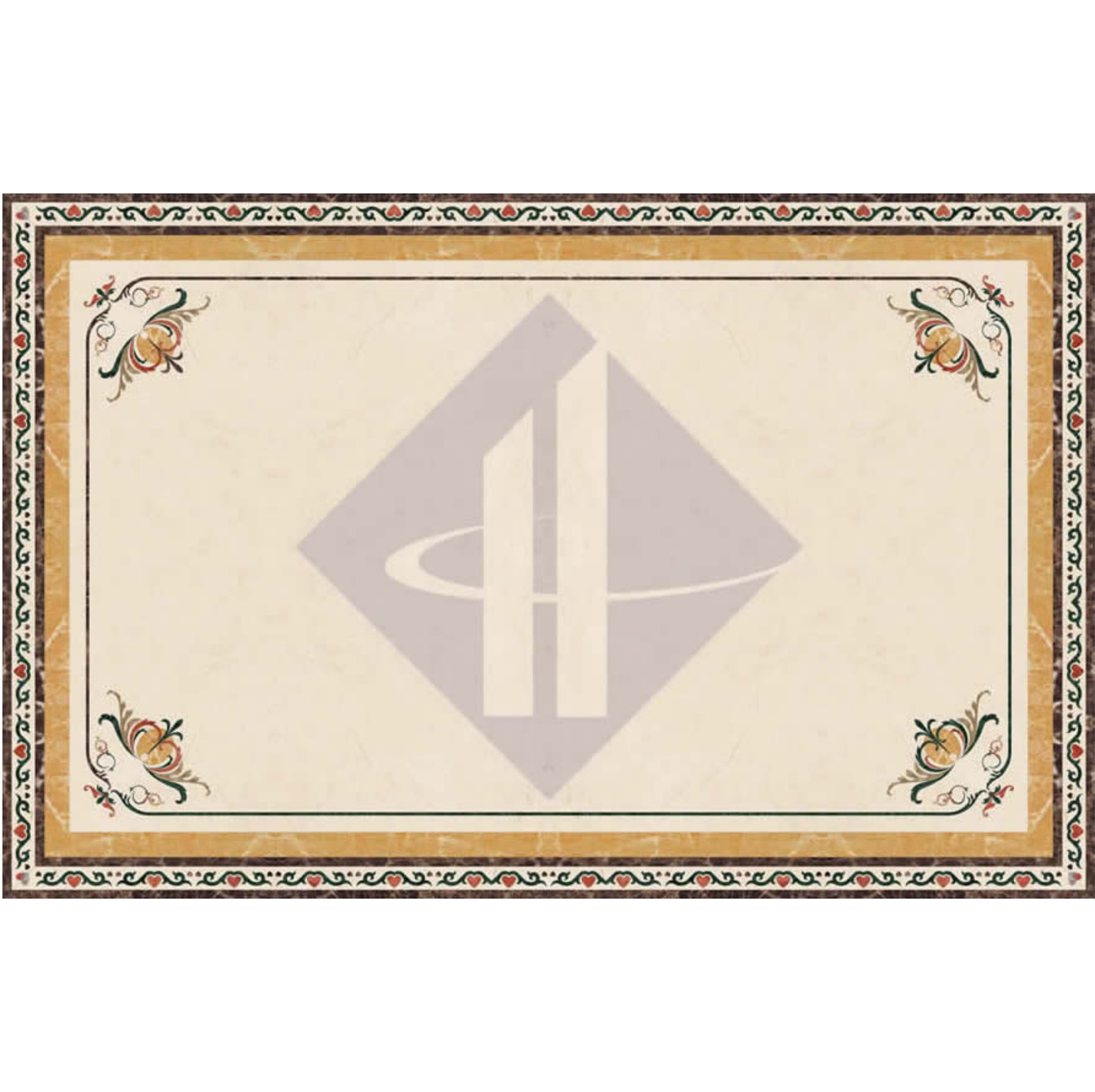 Điểm khác biệt lớn nhất của HT-HVCN012 là việc tối giản hóa phần trung tâm. Nền đá màu kem sáng chiếm diện tích lớn, chỉ được tạo điểm nhấn bằng một đường viền chỉ mỏng và bốn họa tiết hoa lá Tây thanh tú ở bốn góc. Bù lại, toàn bộ sự cầu kỳ được dồn vào hệ thống viền bao quanh. Bao gồm một dải đá màu vàng hổ phách bản rộng sang trọng, và lớp viền ngoài cùng là sự lặp lại liên tục của các họa tiết trái tim đỏ và dải lụa xanh rêu cuộn xoắn trên nền sẫm màu. Thiết kế này giống như một khung tranh tuyệt đẹp, làm nổi bật không gian bên trong nó.