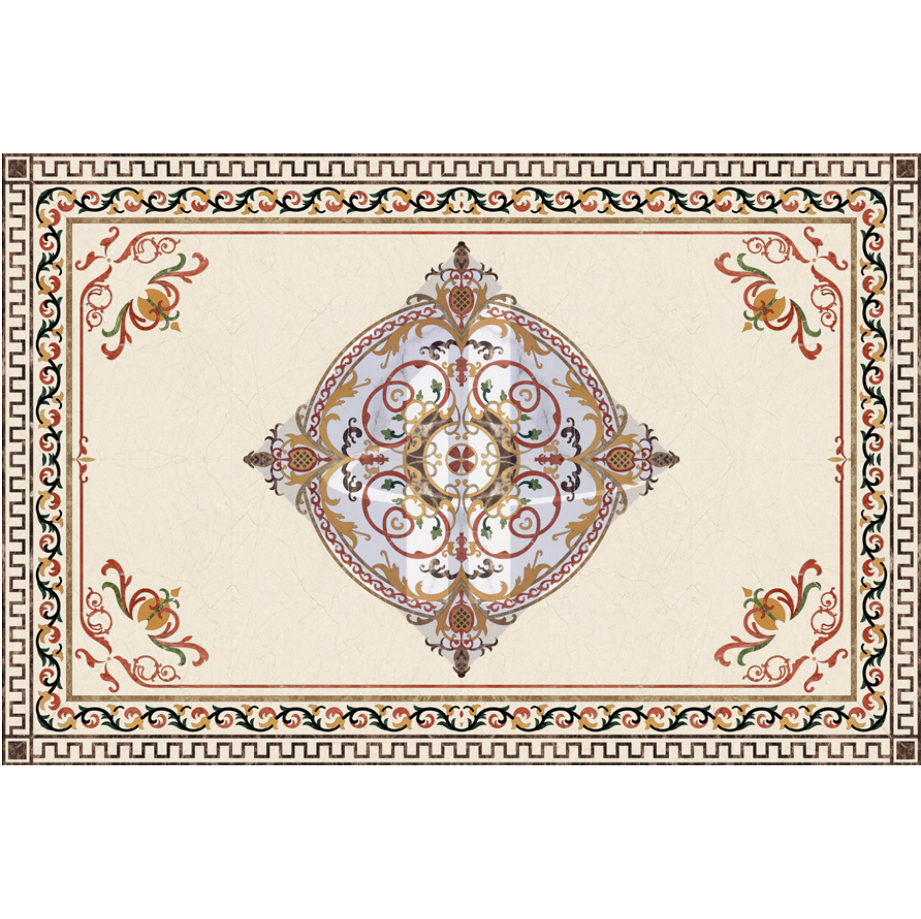 Tâm điểm: Một hình thoi lớn chứa đựng các dải hoa lá Tây cuộn xoắn đối xứng, tạo nên một “trái tim” đầy sức sống cho mặt sàn.