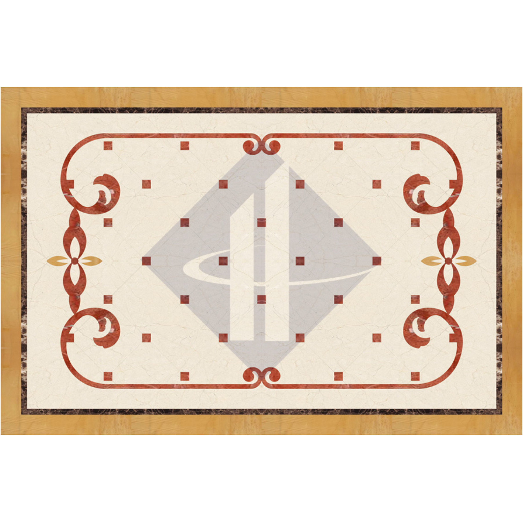 Khung trang trí uốn lượn: Dải họa tiết đỏ sẫm uốn cong mềm mại bao quanh tâm, tạo thành một chiếc khung nghệ thuật bên trong nền đá kem.