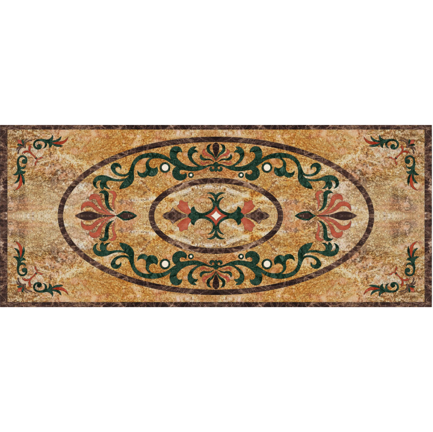 Hoa văn hình chữ nhật HT-HVCN007 sở hữu tông màu vàng nâu ấm áp của dòng đá Granite/Marble cao cấp, gợi liên tưởng đến sự xa hoa của các cung điện. Điểm nhấn trung tâm là hệ thống hai vòng oval đồng tâm với các dải lá Tây cuộn xoắn sắc sảo màu xanh rêu và đỏ gạch. Bốn góc của mâm đá cũng được điểm xuyết họa tiết lá cách điệu đồng nhất, tạo nên một chỉnh thể đối xứng hoàn hảo và đầy quyền uy.