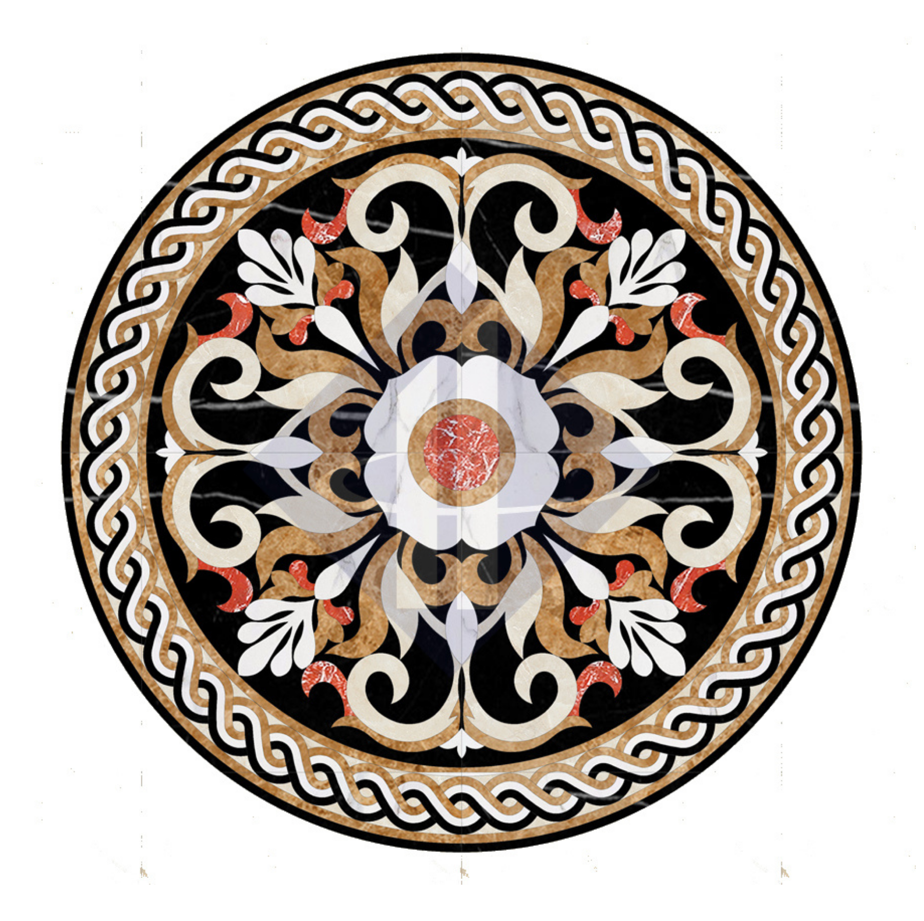 Mẫu hoa văn tròn HT-HVT030 là một trong những thiết kế tiêu biểu cho phong cách Tân cổ điển sang trọng tại Hoàn Thiện Stone. Tác phẩm tập trung vào việc tạo ra sự đối lập mạnh mẽ giữa nền đá đen tuyệt đối và các dải màu sáng của đá tự nhiên, giúp không gian sảnh trở nên lộng lẫy và có chiều sâu nghệ thuật.