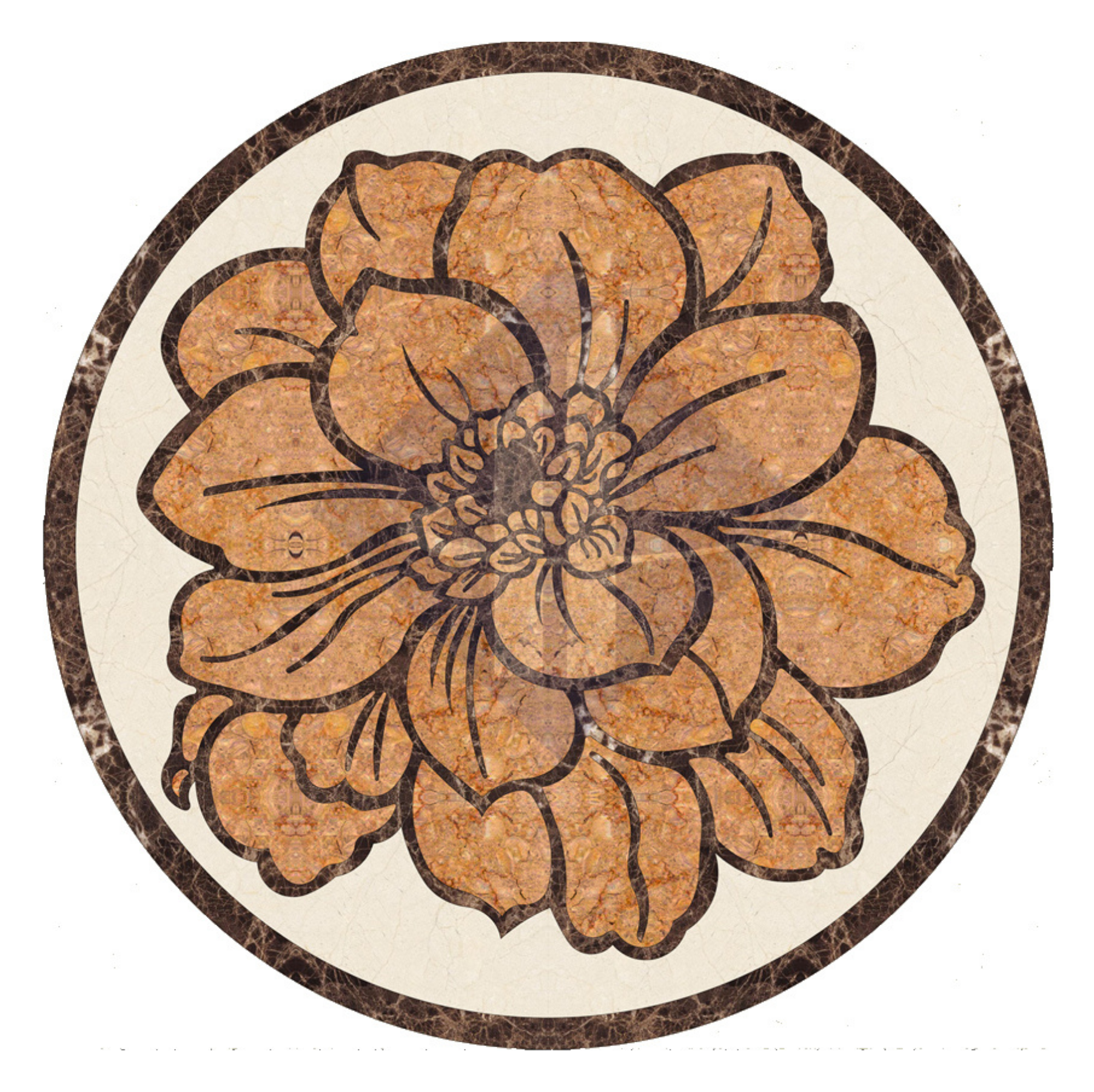 Đá Nâu Dark Emperador: Màu nâu sẫm với vân mây được dùng cho đường viền ngoài cùng và các đường viền cánh hoa, mang lại vẻ vững chãi và cổ điển cho tác phẩm.