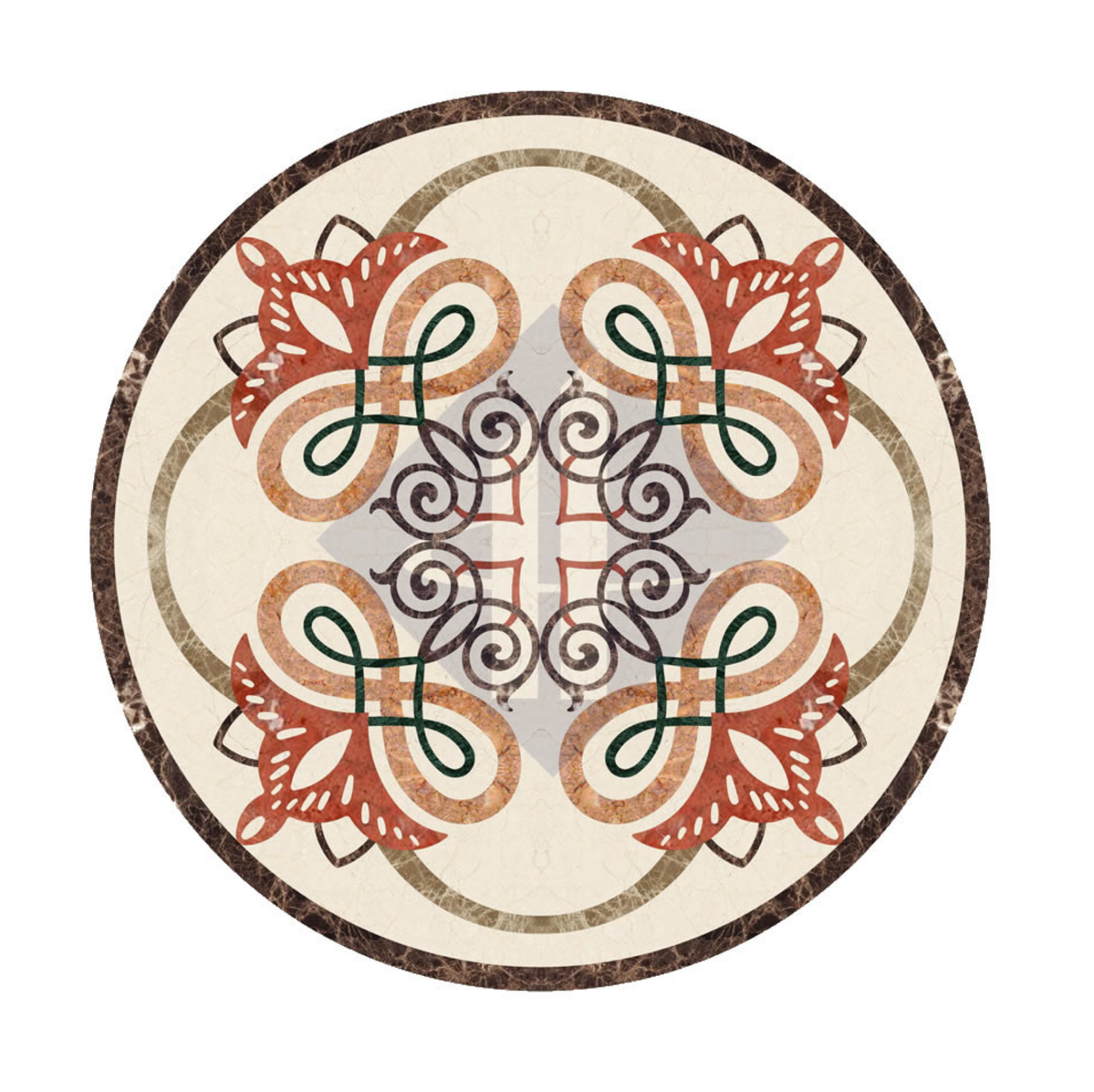 Tâm điểm Mosaic tinh xảo: Chính giữa là một cụm họa tiết cuộn nhỏ đồng nhất với phong cách vòng ngoài, tạo sự đồng bộ và tinh tế cho điểm giao thoa của thiết kế.