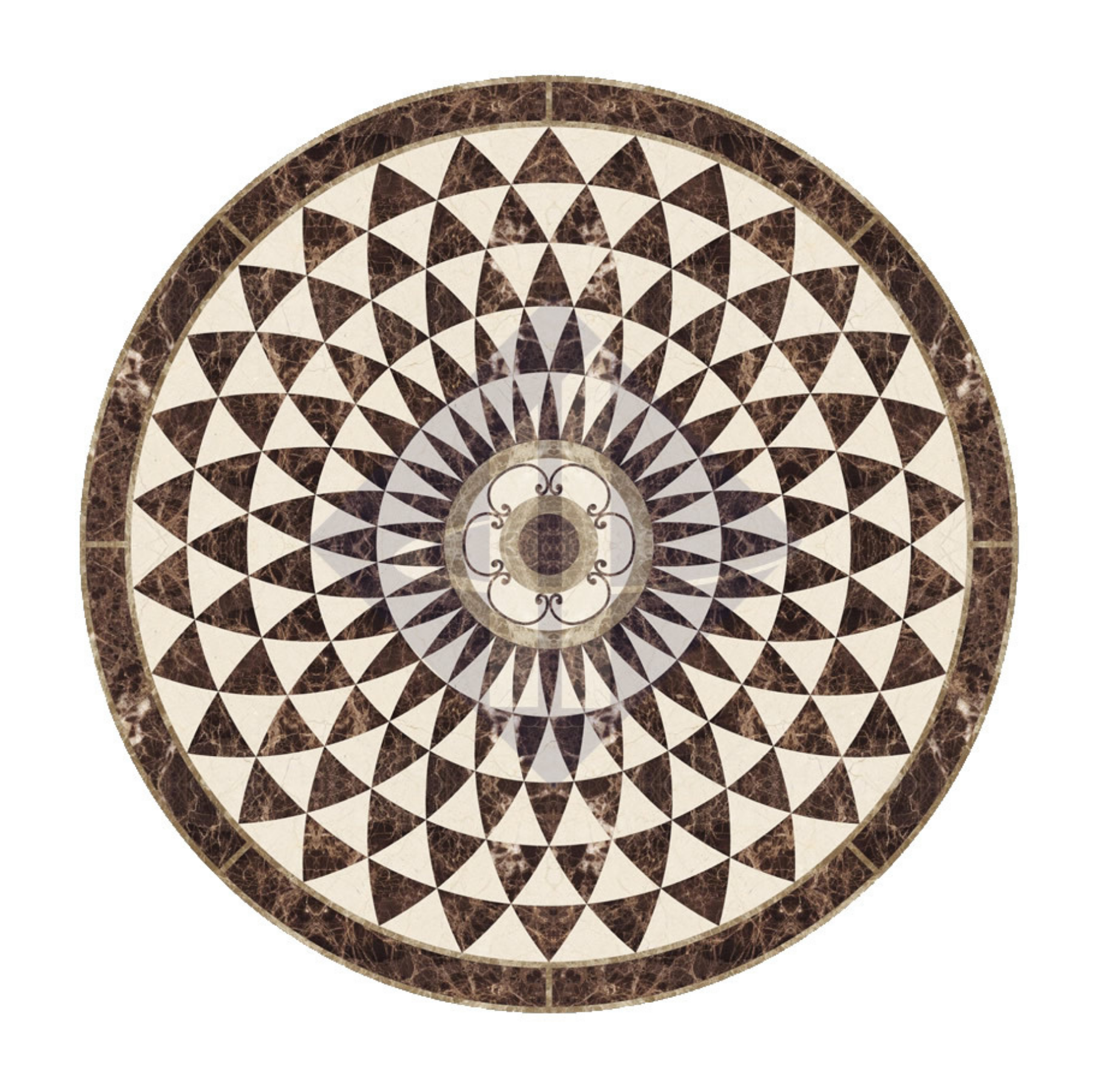 Đường viền bao quanh vững chãi: Vòng ngoài cùng được định hình bằng dải đá màu nâu đậm, giúp cô đọng bố cục và tăng tính sang trọng cho toàn bộ tác phẩm.