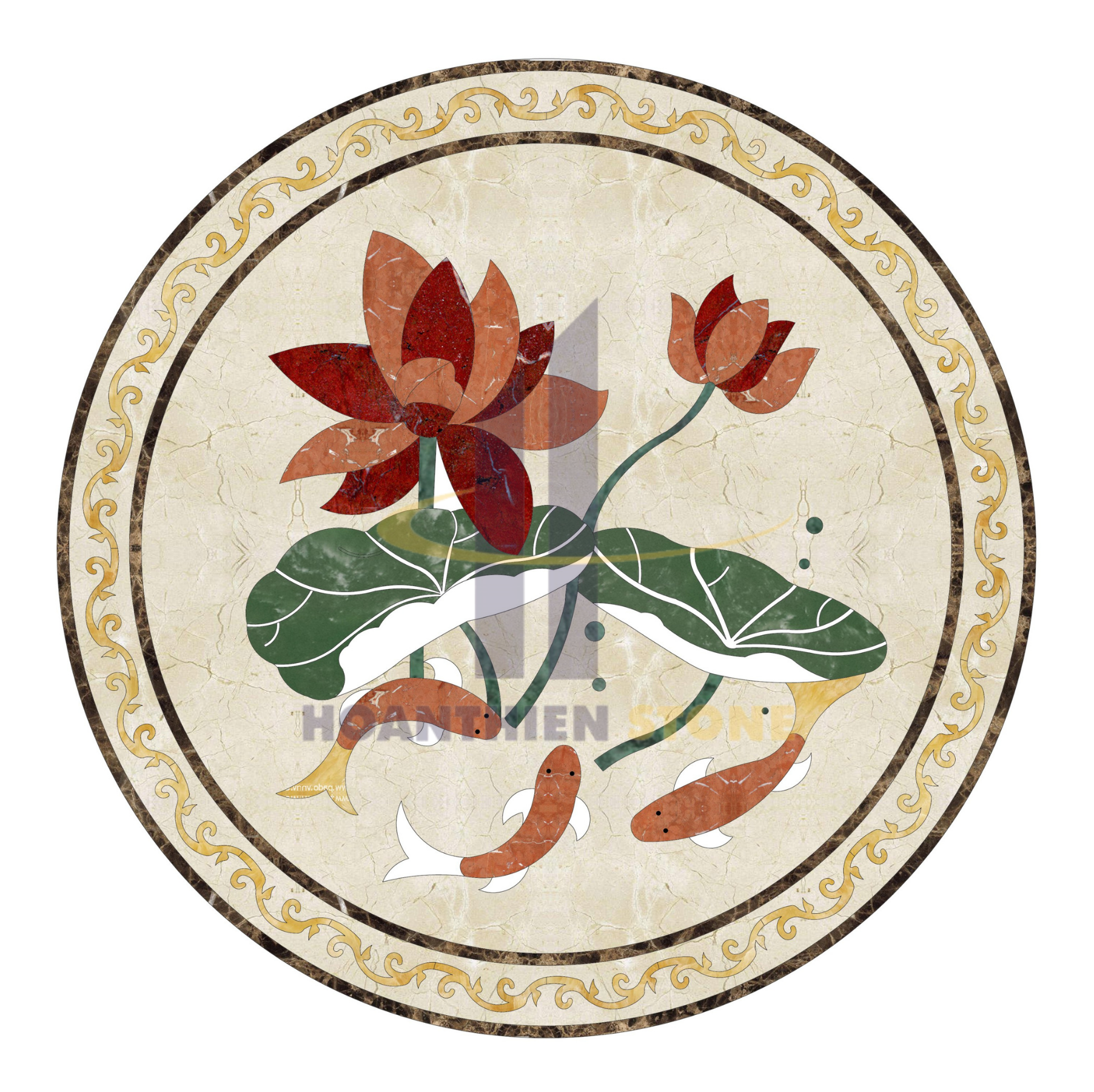 Mẫu hoa văn tròn HT-HVT085 từ thương hiệu HoanThien Stone là sự kết tinh của kỹ nghệ chế tác đá thủ công bậc cao. Sản phẩm không chỉ là một hạng mục trang trí mặt sàn mà còn là một bức tranh phong thủy hữu tình, biểu trưng cho sự thanh cao của hoa sen và sự linh hoạt, sung túc của loài cá. Đây là thiết kế tâm huyết từ Kho đá Hoàn Thiện dành cho những gia chủ yêu thích vẻ đẹp truyền thống hòa quyện cùng chất liệu đá tự nhiên sang trọng.