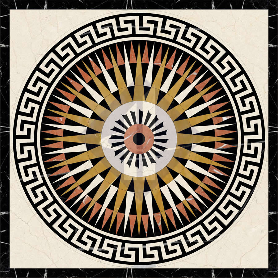 Bảng màu của HT-HVV038 có tính tương phản cực cao, mang hơi hướng của nghệ thuật Art Deco kết hợp Cổ điển. Trên nền đá màu be sáng, dải viền ngoài cùng sử dụng đá đen tuyền (Nero Marquina) dứt khoát. Điểm nhấn là sự đan xen giữa các khối tam giác nhọn mang sắc đen, trắng, vàng đất và cam gạch (terracotta), tạo ra ảo giác quang học về một vầng thái dương đang tỏa sáng. Thiết kế uy quyền này sinh ra để dành cho: