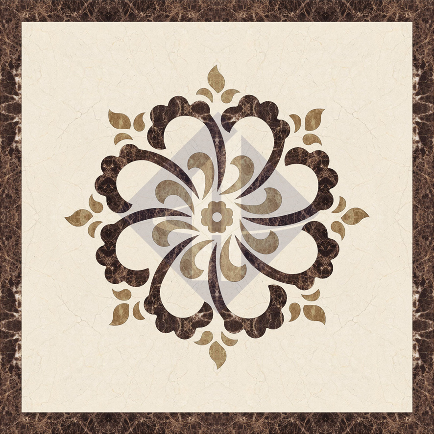 Điểm thu hút của HT-HVV040 chính là sự chắt lọc trong thiết kế. Không sử dụng quá nhiều vòng đai phức tạp, chỉ một đường viền vuông nâu sẫm ngoài cùng đã đủ để định hình không gian. Khoảng trống nền đá màu be rộng lớn bên trong giúp tôn vinh trọn vẹn cụm họa tiết trung tâm, mang lại cảm giác nhẹ nhàng, giúp nới rộng không gian về mặt thị giác.