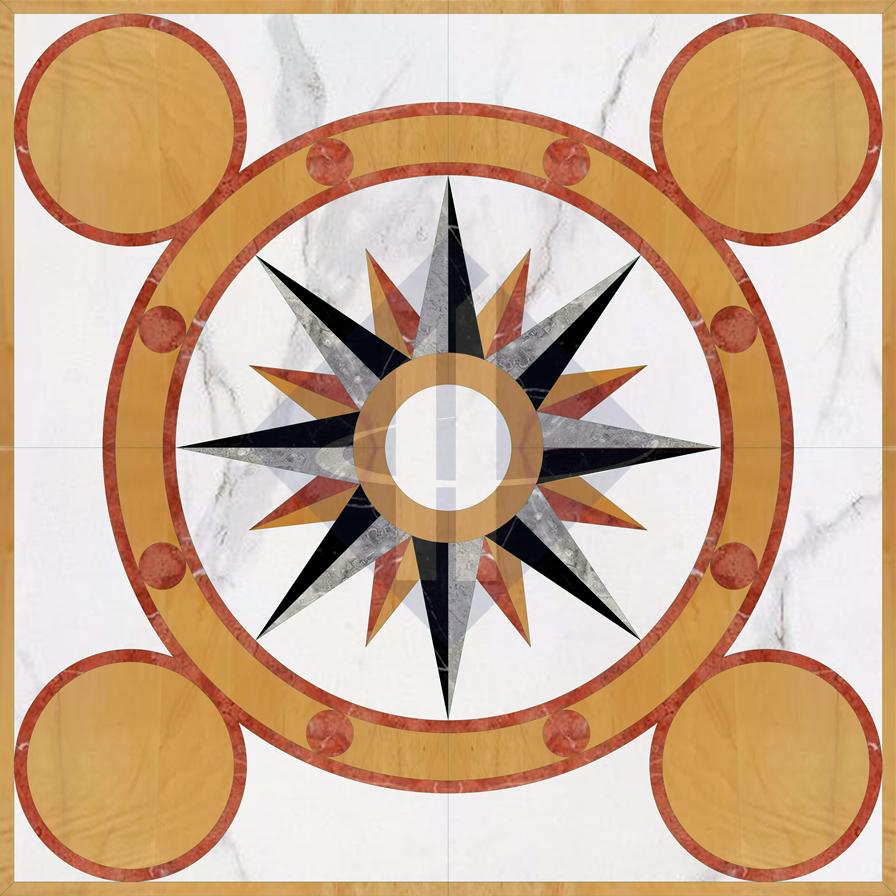 Bảng phối màu của HT-HVV045 là sự đột phá đầy táo bạo. Nền đá marble trắng điểm xuyết những đường vân xám tự nhiên (như dòng Volakas hay Statuario) tạo ra một khoảng không gian rộng mở và bừng sáng. Nổi bật trên đó là các họa tiết sử dụng tone màu nóng rực rỡ: Vàng cam (Gold/Orange), Đỏ gạch (Terracotta), tương phản mạnh mẽ với sắc Đen tuyền và Xám đậm của ngôi sao trung tâm. Sự kết hợp màu sắc có chủ đích này biến HT-HVV045 thành tâm điểm thu hút mọi ánh nhìn, cực kỳ thích hợp cho: