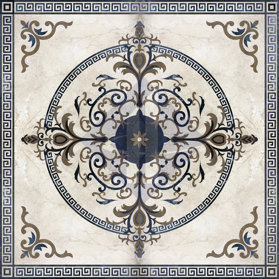 Lõi của mâm đá là một thiết kế đối xứng tuyệt đẹp với họa tiết hoa lá Tây (Acanthus) vươn ra 4 hướng, phá vỡ giới hạn của vòng tròn kỷ hà bên trong. Tâm điểm là một hình tròn màu xanh navy đậm ôm lấy đóa hoa vàng đồng tinh xảo. Những dải lá cuộn xoắn uốn lượn sắc nét, đan xen giữa xanh và nâu, tượng trưng cho sự sinh sôi nảy nở, sự vươn lên mạnh mẽ và sức sống trường tồn. Bốn góc ngoài cùng cũng được điểm xuyết các dải họa tiết đồng bộ, tạo sự liên kết chặt chẽ cho toàn bộ tác phẩm.
