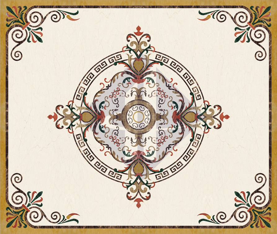Trái tim của HT-HVV066 là một hệ thống hoa lá Tây (Acanthus) đối xứng 4 trục vô cùng tinh xảo. Từ một tâm tròn điểm xuyết họa tiết xoắn ốc nhỏ, các dải lá mềm mại uốn lượn lan tỏa ra bốn phương tám hướng, xuyên qua cả vành đai kỷ hà. Kỹ thuật phối màu được phô diễn đỉnh cao khi từng chiếc lá, từng nụ hoa đều được ghép tỉ mỉ từ những viên đá mang sắc đỏ, xanh, vàng. Tổng thể họa tiết mang ý nghĩa phong thủy về sự sinh sôi nảy nở, tài lộc dồi dào và vượng khí lan tỏa khắp không gian ngôi nhà.