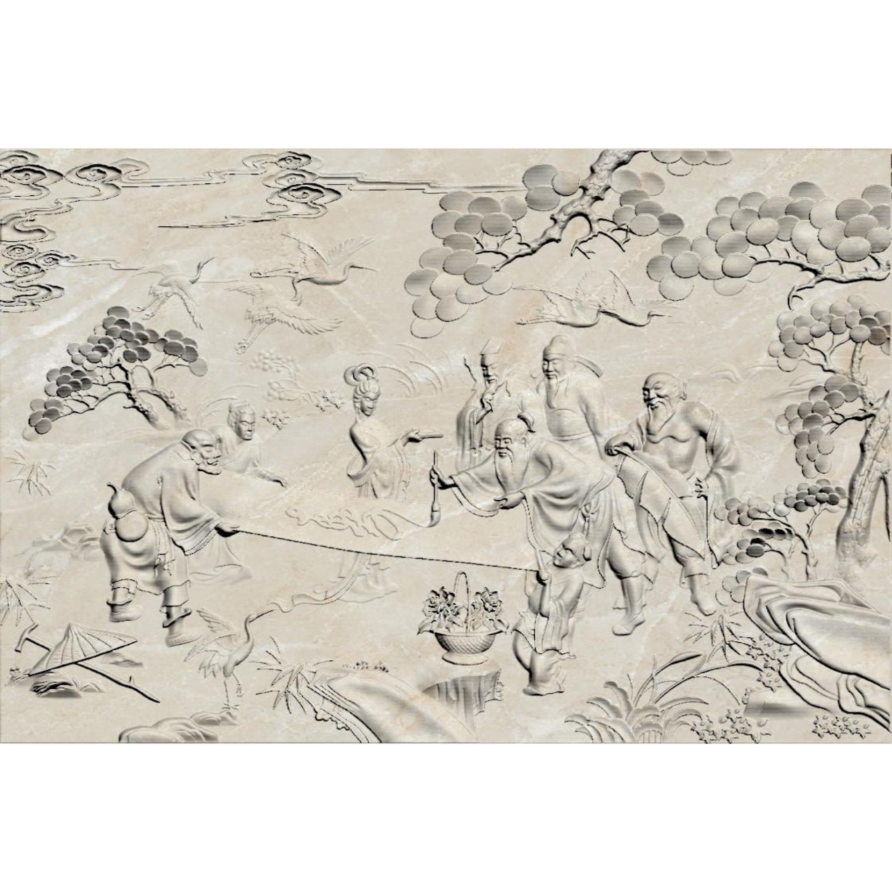 Tác phẩm khắc họa cảnh sinh hoạt cổ điển với hình ảnh con người, chim hạc, cây tùng và thiên nhiên, tạo nên một tổng thể sống động, hài hòa và giàu ý nghĩa phong thủy.